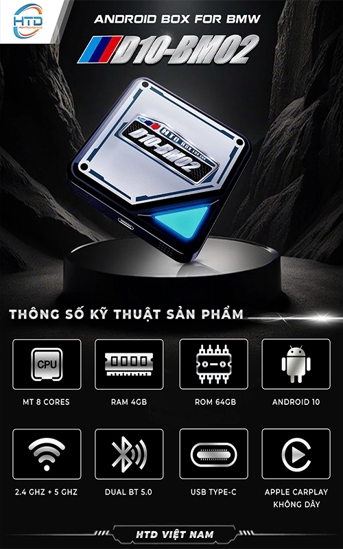 Android Box cần tương thích hoàn toàn với hệ thống Apple CarPlay hoặc Android Auto không dây của BMW. Thiết bị nên kết nối nhanh, nhận tín hiệu ổn định và hiển thị mượt mà trên màn hình trung tâm. Dòng D10-BM02 được HTD Việt Nam tối ưu riêng cho BMW, giúp cắm là chạy, không cần cài đặt phức tạp.